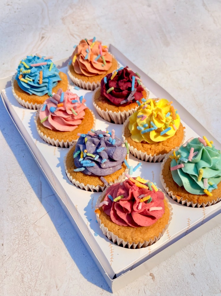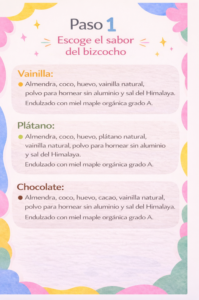 Vainilla: Almendra, coco, huevo, vainilla natural, polvo para hornear sin aluminio y sal del Himalaya. Endulzado con miel maple orgánica grado A.