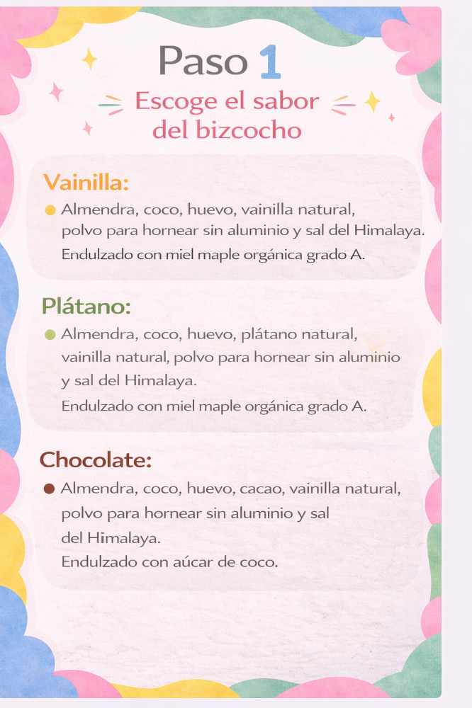 Bizcocho: Harina de almendra, coco , huevo, bebida de almendra o coco, vainilla natural, polvo para hornear sin aluminio y sal del Himalaya.