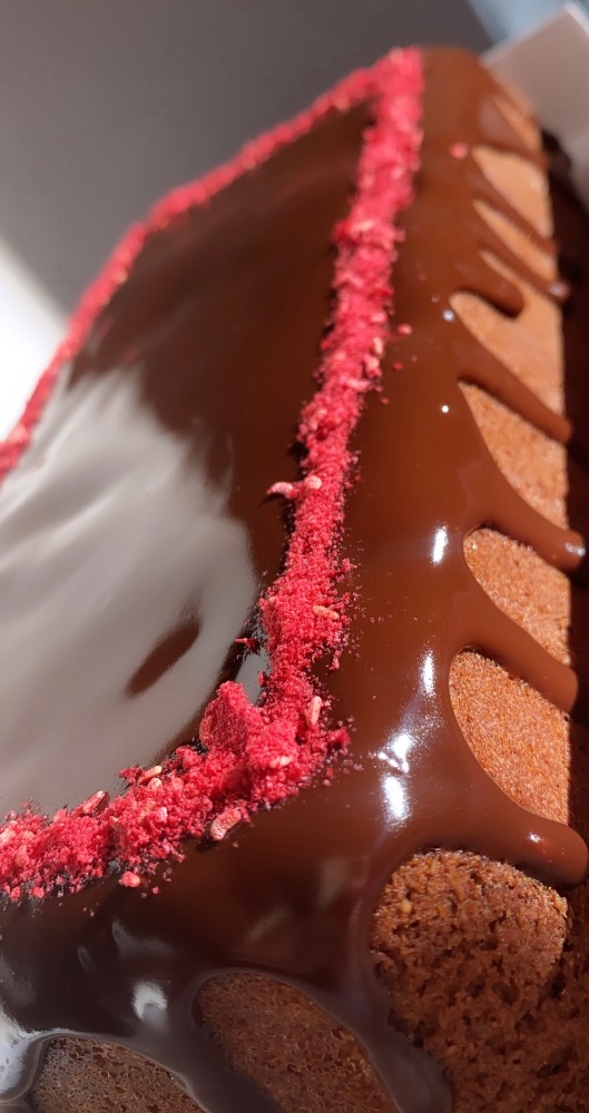 Panqué sabor chocolate, con ganache de chocolate, decorado con polvo de frambuesa liofilizada.