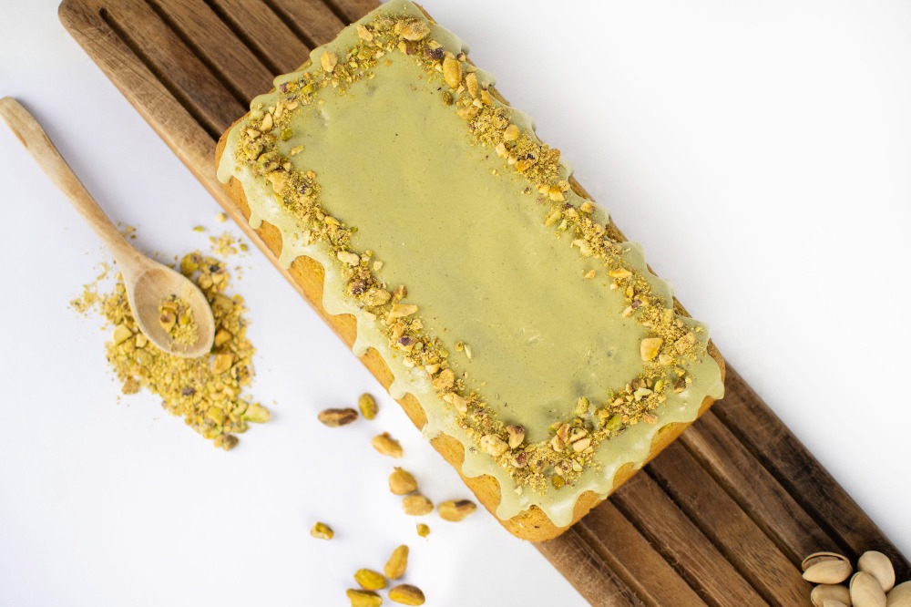 Panqué de pistache con glaseado de leche de almendra con pistache.