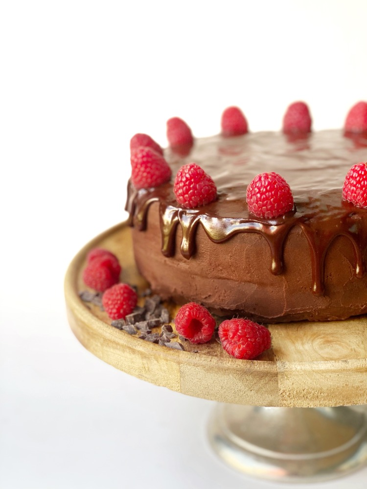 Nuestro clásico: Doble bizcocho de chocolate decorado con betún, Ganache de chocolate y decorado con frambuesas.