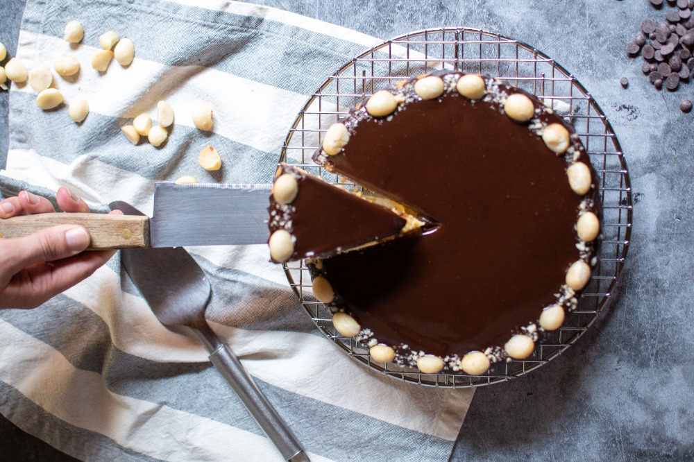 Bizcocho sabor vainilla con cubierta de Ganache de chocolate y espolvoreado con macadamias en la parte superior.